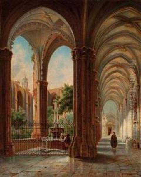 "kreuzgang Eines Zisterzienser Stiftes Mit Kirchenruine Undfigurenstaffage"