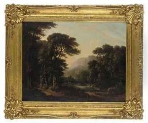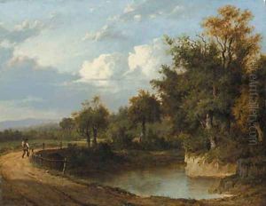 Wooded Lake Scene With Boat & Figures