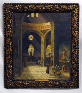 Elaborate Painting Of The Interior Of A Cathedral With Figures