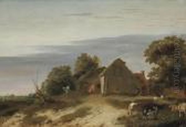 A Pastoral Landscape With Figures Milking Cows In A Farmhouse Yard