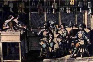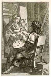 Artist painting a portrait over a grid for accurate proportion, printed Paris 1737