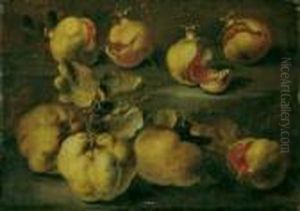 Pomegranates, Figs, Grapes, Roses And A Carnation On A Stone Ledge