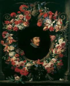 Blumenkranz Um Eine Kartusche Mit Dem Bildnis Eines Herrn (collab. W/jacob Van Oost (the Younger))