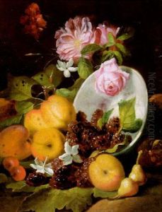Still Life Of Peaches, Pomegranates And Grapes Upon A Pewter Plate, Together With Figs And Roses