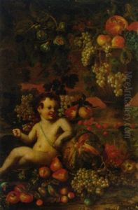 A Putto Amongst Fruit In A Landscape, With Fruit In An Urn Beyond