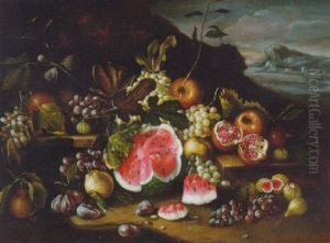 Grapes, Apples, Pears, Figs, Pomegranates And A Watermelon On A Ledge With A Landscape Beyond