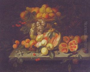 A Pomegranate, Apples, Peaches, Pears, Cherries And Grapes In A Basket With Other Fruit Strewn On A Stone Ledge