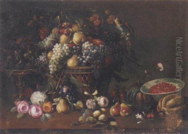 Pears, Grapes, Plums, Apricots And Other Fruit And A Parrot In A Basket, Figs On A Silver Tazza, Cherries In A Bowl With Other Fruit And Flowers On A Wooden Ledge