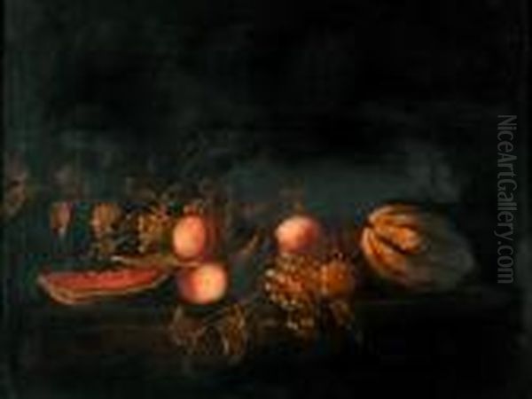 Still Life Of Melons, Peaches, Grapes And Figs Upon A Ledge