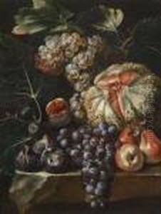 Stilleben Mit Fruchten Und Tongefass Mit Einem Rosenstrauch In Einer Landschaft