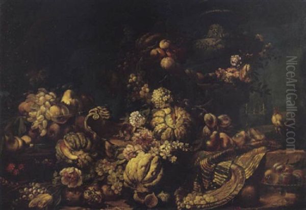 Vasellame Con Meloni, Uva, Melograni, Susine, Pere, Fichi E Grano, Un'alzata Con Pere E Susine E Un Vaso Di Vetro Con Pere, Uva E Pesche, In Un Giardino Italiano