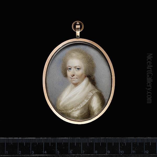 A Lady, Wearing White Dress With Lace Edged Fichu, Her Hair Curled And Powdered.