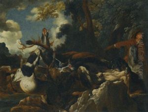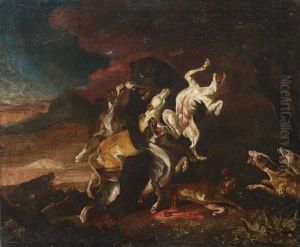 Hounds Attacking A Boar In A River Landscape (also Attributed To Pieter Boel & Studio)