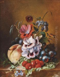 Still Life with a Basket of Peaches, Plums and Cherries together with a Blackbird and a Yellow Oriole on a Ledge