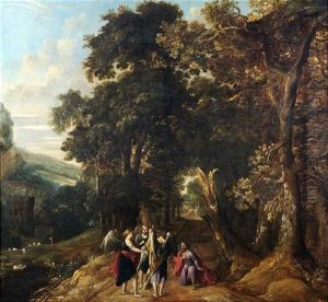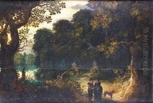 A Wooded River Landscape With Shepherds Conversing On A Track
