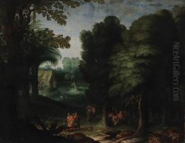 A Wooded Landscape With Peasants Feasting In A Clearing