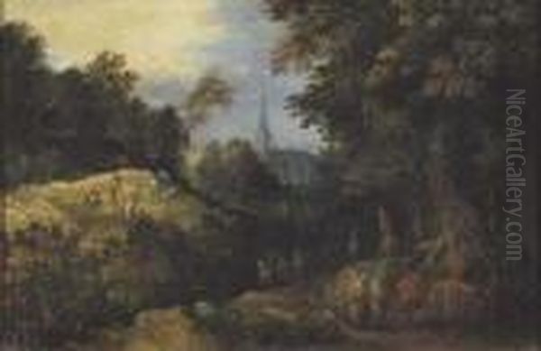 Paesaggio Boscoso Con Viandanti E Falciatori Di Grano