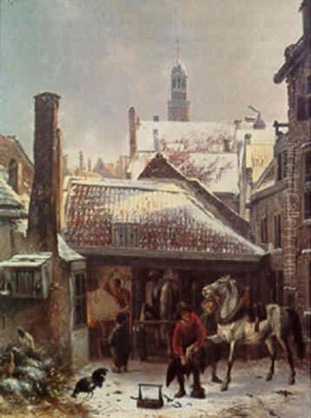 Winter: A Blacksmith At Work In A Yard, With The Buurtkerk, Utrecht, Beyond