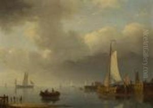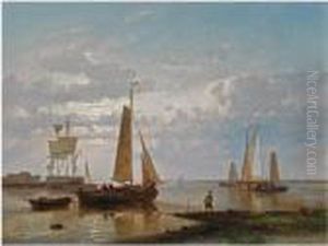 Figures By A Tranquil Shore With Moored Barges And Tall Ships In The Distance