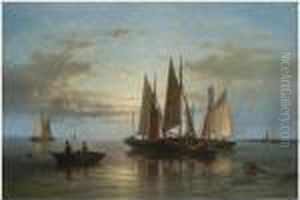 Sailing Vessels In A Moonlit Harbor With Fishermen And Their Boats In The Foreground