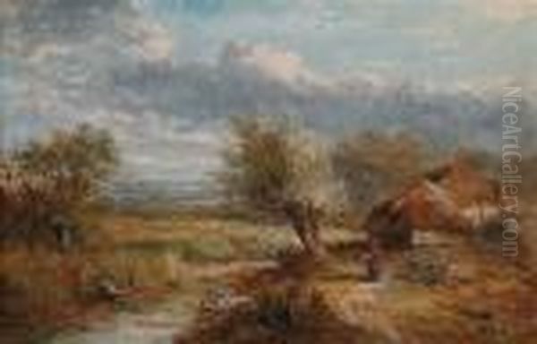 Summer Landscape With Farm Cottages By A Stream