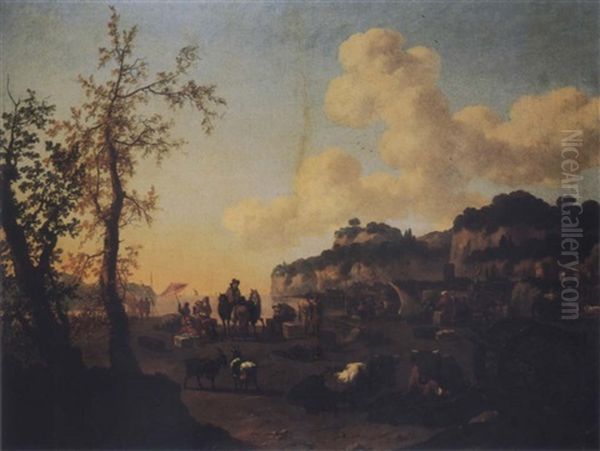 A View Of A Mediterranean Harbor With Cattle And Goats, A Cannon And Figures Unloading Ships Beyond
