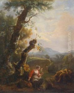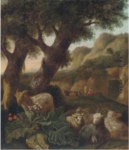 A wooded landscape with sheep and figures resting