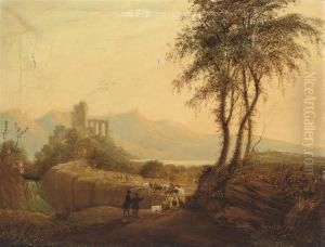 An Extensive Landscape With Drovers And Other Figures With Sheep, Cattle And Goats By A Stream