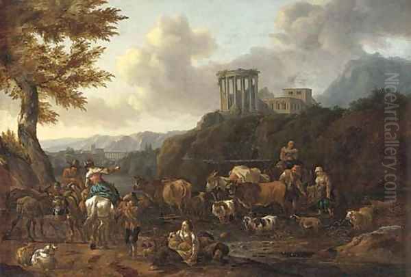 An Italianate landscape with drovers fording a river, the Temple of the Sibyl at Tivoli beyond
