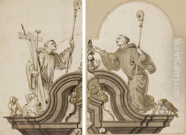 Deux Etudes D'eveques Agenouilles Sur Une Corniche Et Tenant Unecrosse