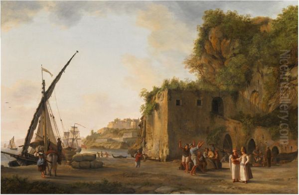 A port with Maltese merchants and sailors, the fort of Gaeta beyond