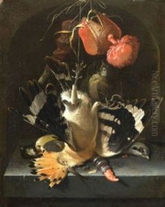 Still Life Of Grapes, Pomegranates And Vine Leaves Hung Before A Niche, With A Snail And Other Insects