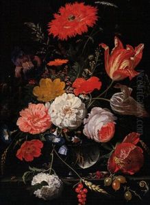 A Still Life Of Roses, Poppies, A Parrot Tulip, Convolvulus, A Carnation, Blackberries, Redcurrants, Corn, Parsley And Other Flowers In A Glass Vase On A Stone Ledge Surrounded By Insects