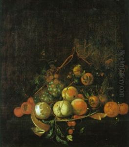 A Still Life Of Red And White Grapes In A Basket, Peaches, Plums, Chestnuts, An Ear Of Corn And Gooseberries Resting On A Forest Floor, With Snails, Butterflies, A Caterpillar, Wasp And Other Insects