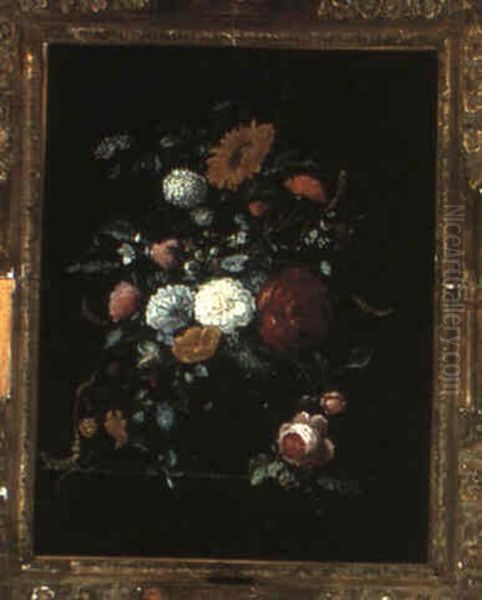Still Life Of Flowers In A Vase On A Stone Ledge