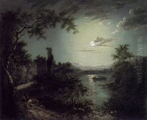 Moonlit River Landscape With Fisherfolk Gathering In Their Catch