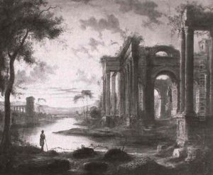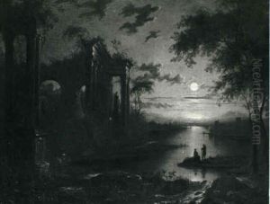Moonlit River Landscape With Figures And Cattle On A Path Before A Ruin
