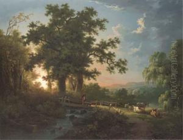 A Wooded River Landscape, With A Faggot Gatherer On A Bridge,cattle And Sheep