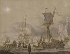 A View Of A Dutch Harbour On The Zuiderzee With A Buis, A Merchantman And Other Boats, Together With Merchants Unloading Their Goods