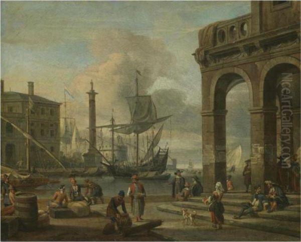 A Mediterranean Harbour Capriccio With Figures Unloading Cargo Inthe Foreground