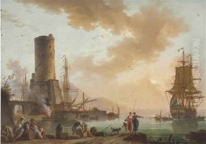 A Mediterranean harbour with elegant figures and fishermen by the quay, a ship and a lighthouse beyond