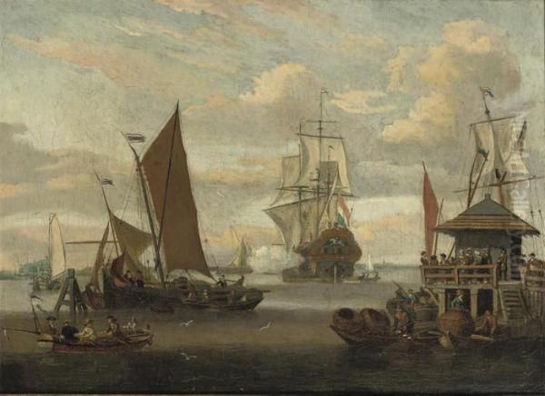 A View Of The Ij, Amsterdam, With Spectators On The Jetty Of A'boomhuisje' Watching A Man-o'-war Firing A Salute And Fishermenlanding Lobster Pots