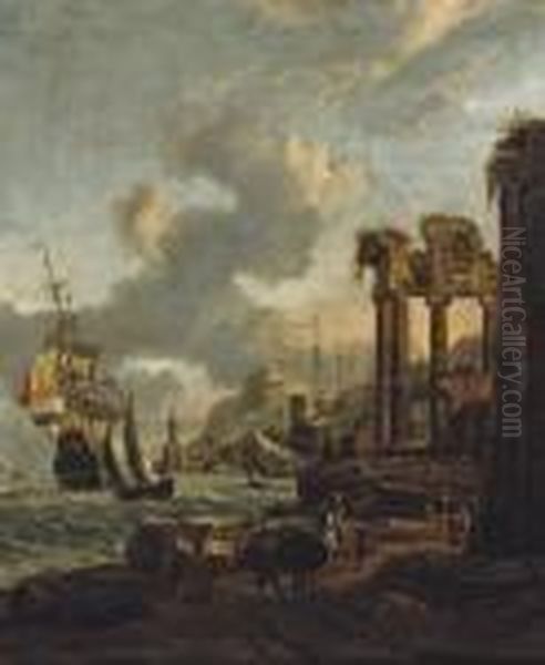 A 'capriccio' View Of A Mediterranean Harbour With A Man O' War Bearing The Coat-of-arms Of Amsterdam
