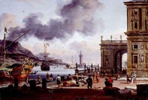A southern port scene with numerous figures on a quayside