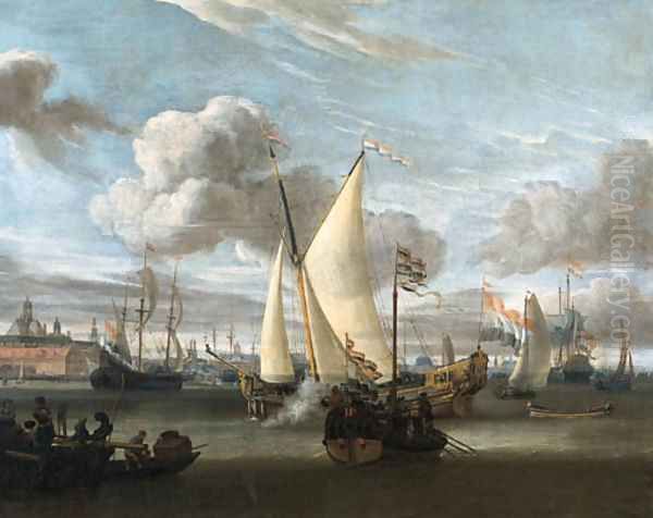 Shipping in the Harbour of Amsterdam with a Dutch East India Company yacht and a state barge in the foreground