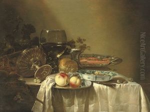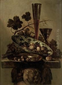 A Still Life Of A Peeled Lemon On A Pewter Dish, Grapes, And A Roemer, All On A Table Draped With A Red Cloth