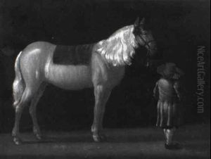Two Horses In A Barn With A Groom, A Dog And A Goat