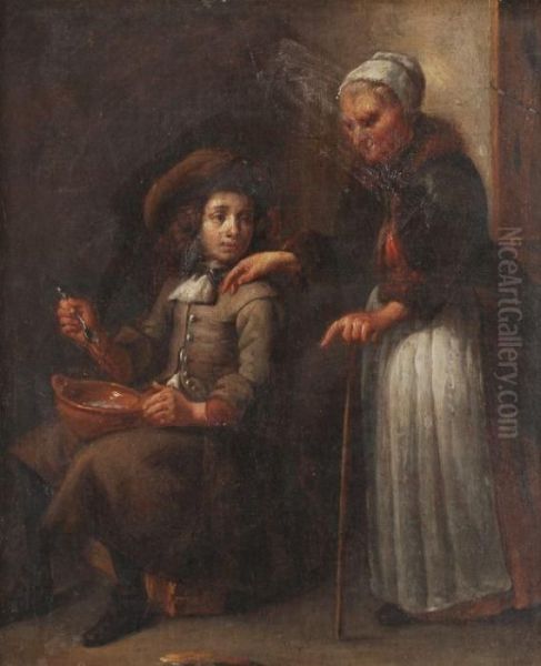 A Peasant Interior With An Old Woman And A Young Boy Eating