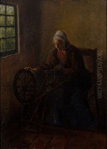 A Woman Reading In A Cottage Interior With A Spinning Wheel