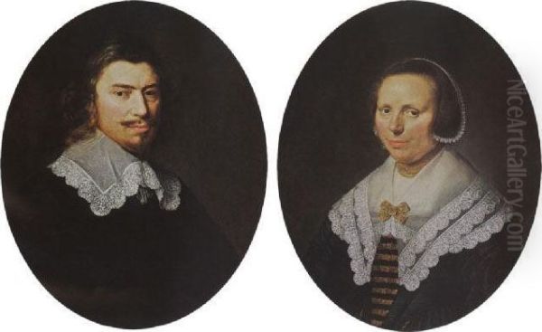 A Portrait Of Simon Elsevier (1621-1679), Bust Length, Wearing A Black Coat With A Lace Collar; A Portrait Of Jenneke De Bosch (1613-after 1668), Bust Length Wearing A Black And Gold Embroidered Dress With A Lace Colar, Gold Necklace And A Lace Cap